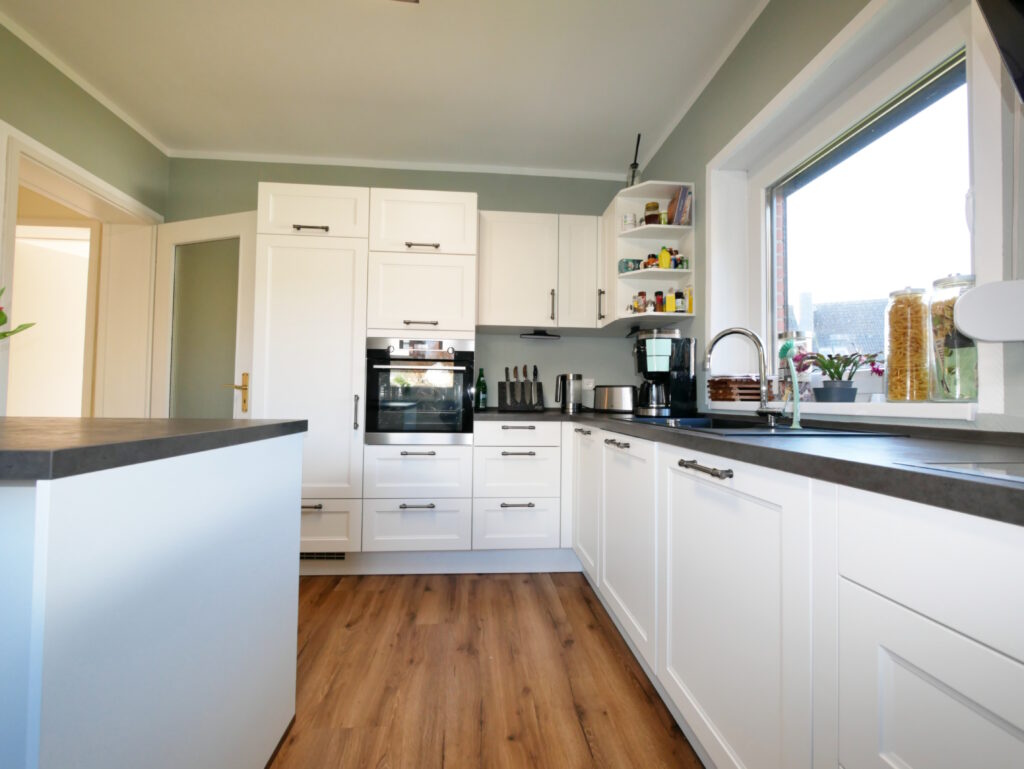 Viel Spaß beim Kochen: Vom Flur aus erreichen Sie die moderne und sehr durchdachte stilvolle Küche (im Landhausstil) von Nobilia aus dem Jahre 2024. Die weiße Einbauküche mit namenhaften Elektrogeräten (großes Induktionskochfeld, Ofen auf Brusthöhe, Kühlschrank, Wrasenabzug nach außen und Geschirrspüler) gehört zum Angebot dazu. Eine Vielzahl an Schränken, Auszügen und Schubladen sorgen hier für perfekte Ordnung. Des Weiteren ist noch ein separater Küchenblock vorhanden, der ebenfalls Abstellmöglichkeiten durch 6 Auszüge beinhaltet. Der Raum ist hell und freundlich (2 Fenster) und der Boden ist mit einer ansprechenden Designplanke ausgestattet. An die Küche schließt sich noch eine separate Speisekammer an (ebenfalls mit Fenster).