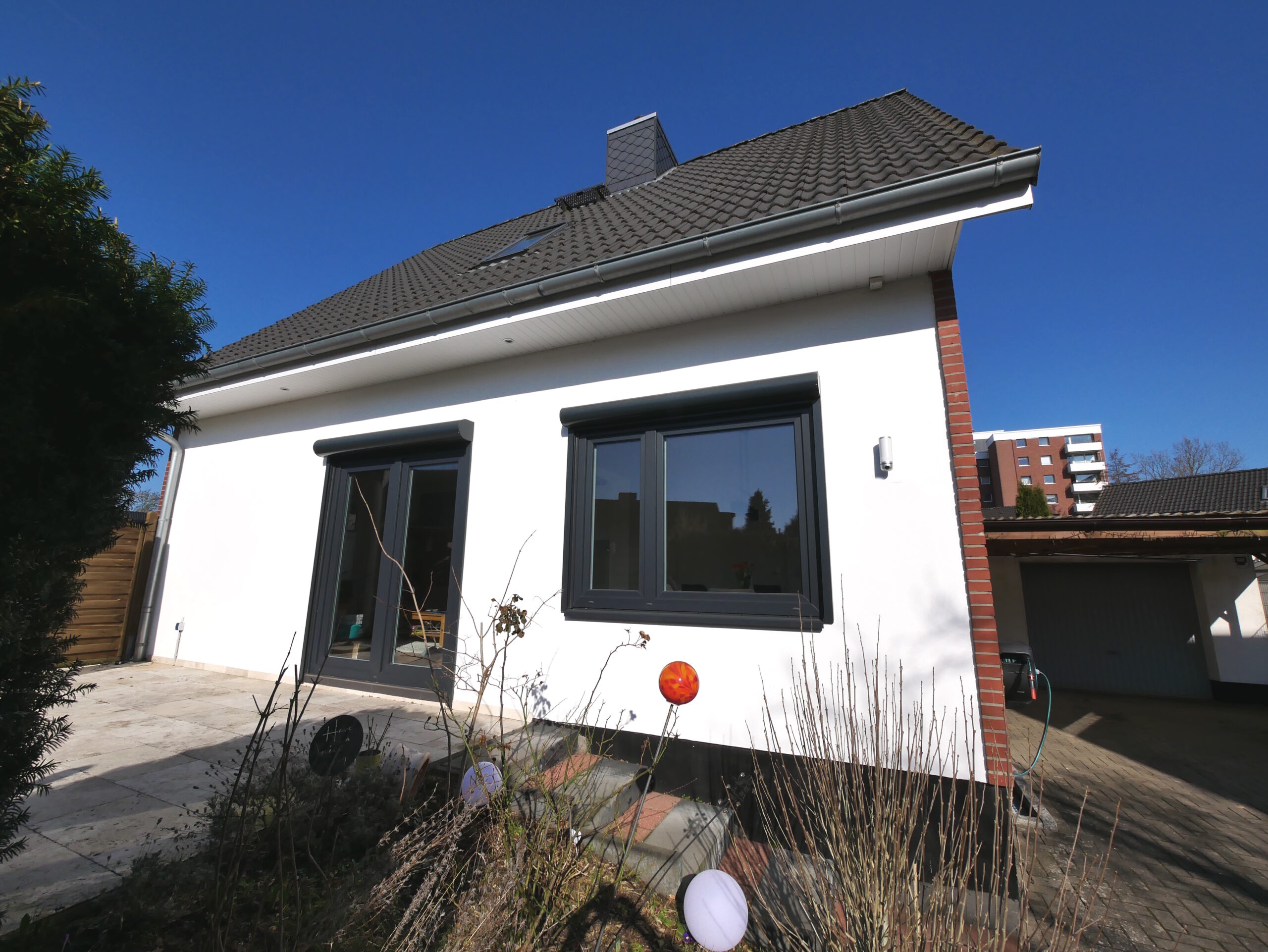 Die Fensterrahmen sind aus Kunststoff und die Fenster verfügen über eine 3-fach Isolierverglasung. Ein Großteil der Fenster wurde in 2018 (oben) und 2021 erneuert und sind überwiegend mit Außenrollläden ausgestattet, die ebenfalls erneuert wurden. Des Weiteren wurde in 2021 auch die Haustür neu eingebaut. Das Dach wurde im Jahre 2017 erneuert. Die Innentüren und Zargen im EG und DG sind weiß gestrichen.