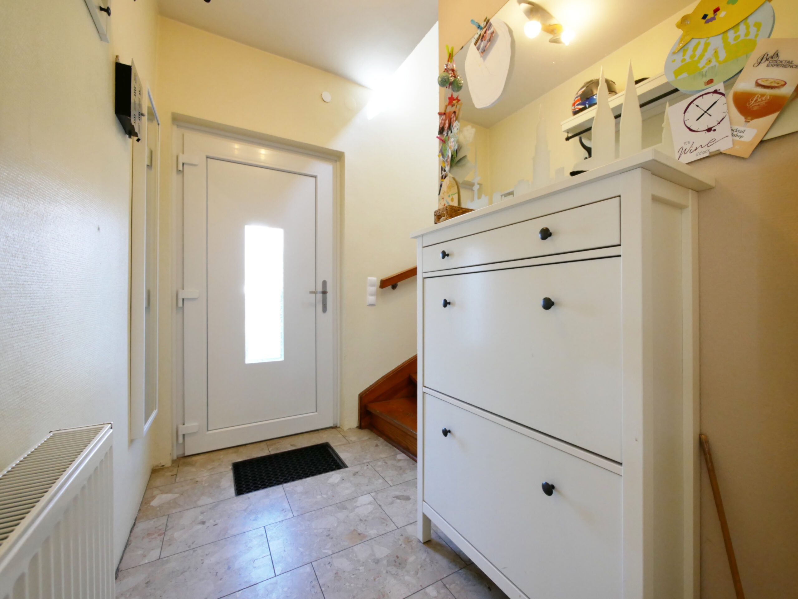 Hereinspaziert: Der als „L“ geschnittene Flur ermöglicht Ihnen ausreichend Platz für eine Garderobe, Anrichte, Sitzbank o.ä. Wie praktisch: Es gibt hier auch einen kleinen Abstellraum. Der gesamte Eingangsbereich ist mit einer Fliese aus dem Baujahr ausgestattet.