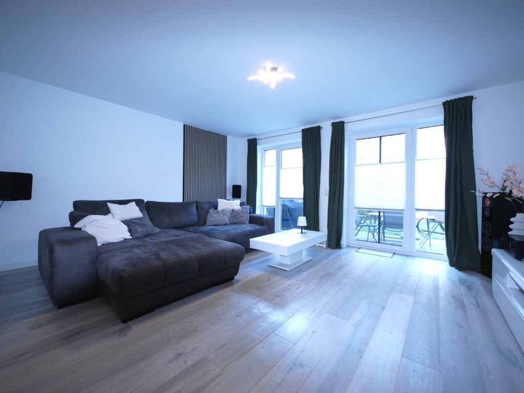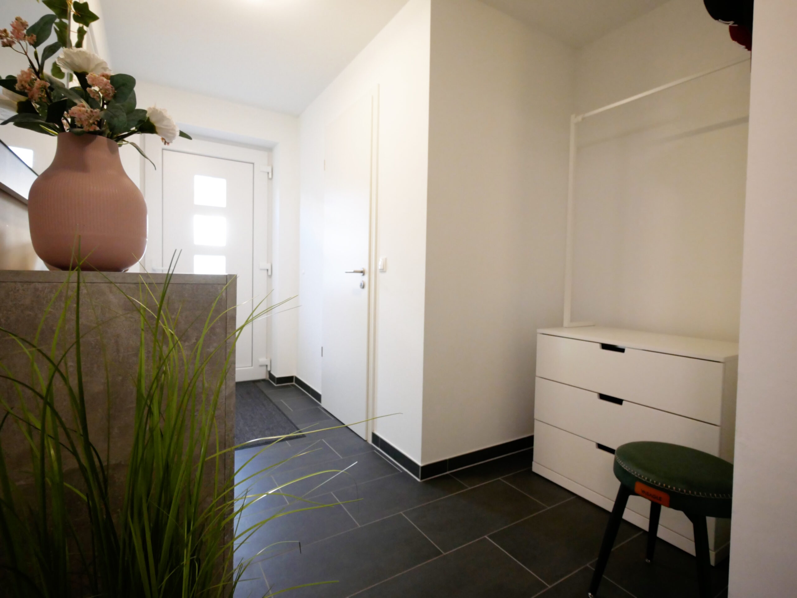 Der Eingangs- Flurbereich mit Garderobenecke, das Gäste-WC und die Küche sind mit edlen, anthrazit-farbenen, größeren Bodenfliesen belegt. Der Wohn- Essbereich ist mit einem geschmackvollen Echtholzparkett (helles Holz, gekälkt) ausgestattet. Der Flurbereich, die 3 Zimmer im OG und das ausgebaute Staffelgeschoss sind mit einem Design- Bodenbelag in heller Holzoptik ausgestattet.